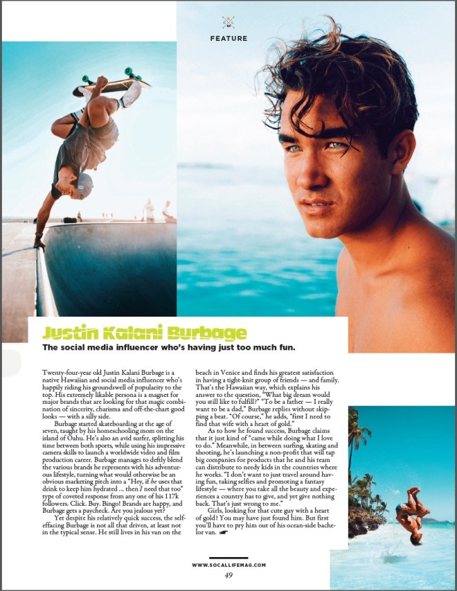 Twenty-four-year old Justin Kalani Burbage is a native Hawaiian and social media influencer who’s happily riding his groundswell of popularity to the top. His extremely likable persona is a magnet for major brands that are looking for that magic combination of sincerity, charisma and off-the-chart good looks—with a silly side.